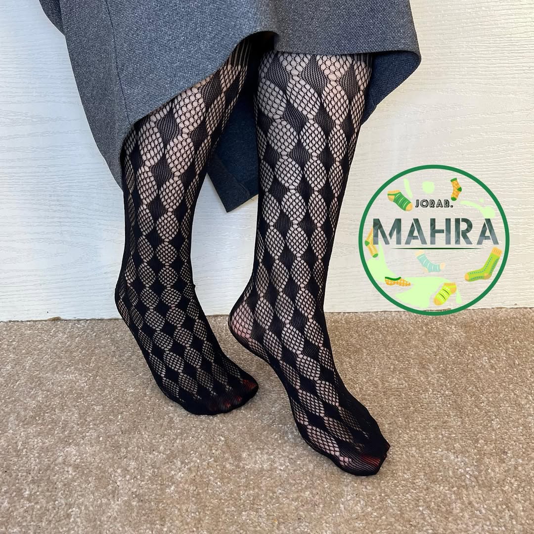 جوراب گیپوری ساق بلند با طرح لوزی فقط رنگ مشکی داره بالای زانو هستش